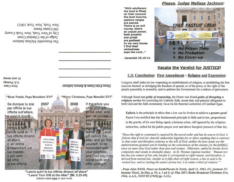 On the reverse side of the card you are free to write a letter in your own words why you do not think I should have to serve anytime, probation or community service for exercising not only my faith but in calling for the Justice deserved and far overdue to those violated under the auspices of the Catholic authorities.